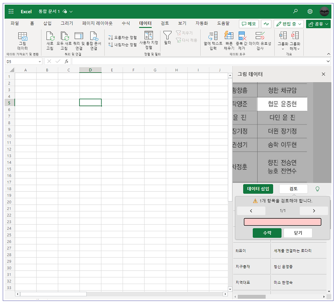 분석이 완료되면 곧바로 엑셀로 삽입이 되는 것이 아니라 아래와 같이 '그림데이터'에 추출된 텍스트가 우선 표시됩니다. 데이터가 정상적이지 않거나 올바르게 추출되지 않은 항목은 빨간색으로 표시해 주기 때문에 데이터를 검수하기도 매우 편리하게 작동됩니다.