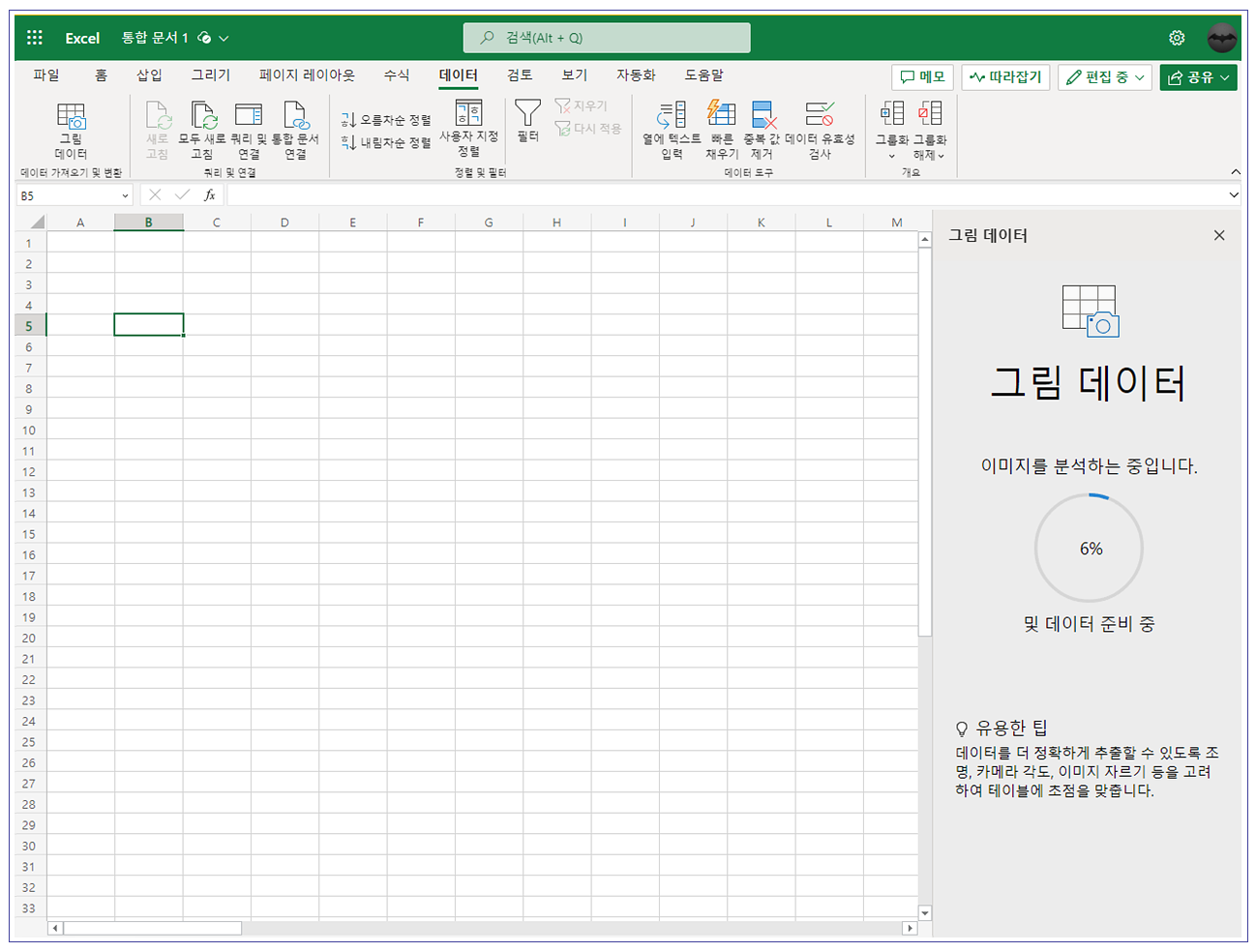 엑셀 프로그램이 그림을 분석하기 시작합니다. 여러 가지 이미지를 테스트해 본 결과 적게는 5초 많게는 약 30초까지도 걸리는 듯합니다.