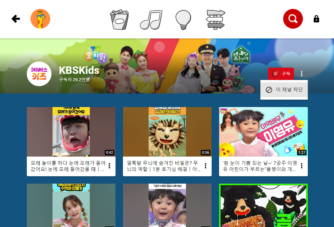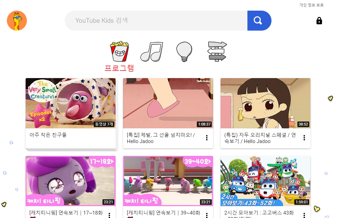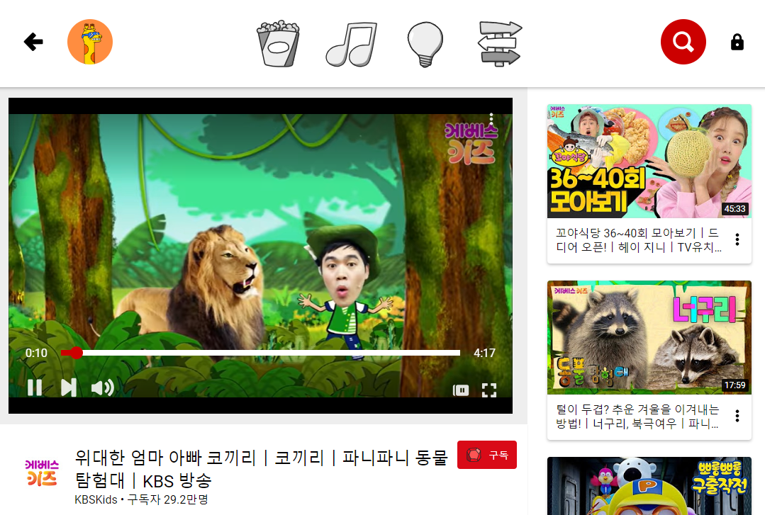 우선 PC버전에서 유튜브키즈에 접속한 화면인데요. 기존 유튜브와 접속 주소도 다르고 화면 구성도 매우 다릅니다. 웹 기반으로 아주 심플하게 구성된 화면입니다. 좌상단에 프로필, 중앙에 유튜브 키즈 검색창, 하단으로 프로그램/음악/학습 등 몇 가지 카테고리가 보입니다.