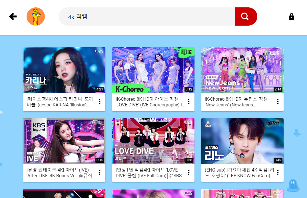 정말 유튜브키즈가 맞는지 한번 검색을 해볼까요? 조금은 선정적일수 있는 '4K 직캠'을 검색해 보았습니다. 음.. 추천된 콘텐츠들과 성격을 비교해 보았을 때 나오면 안 될 것 같아 보이지만 그래도 요즘 아이들이 걸그룹 노래를 많이 듣고 막 춤도 따라 부르기 때문에 이 정도는 그래도 문제는 없을 것 같습니다.