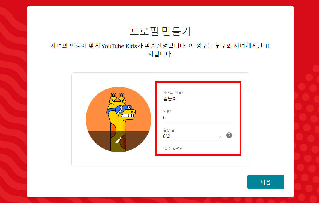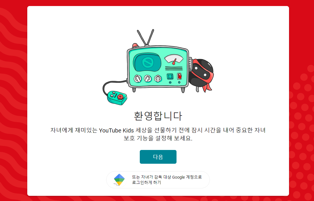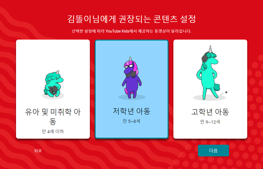 안내사항과 함께 유튜브 키즈 채널 세팅이 곧바로 시작되는데요. '다음'버튼을 눌러줍니다.