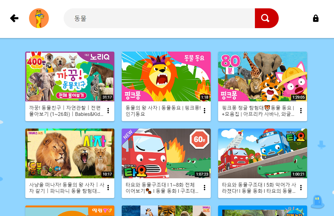 이번엔 '동물'키워드로 검색을 해보았습니다. 키워드와 관련된 유튜브 키즈 영상이 노출됩니다.
