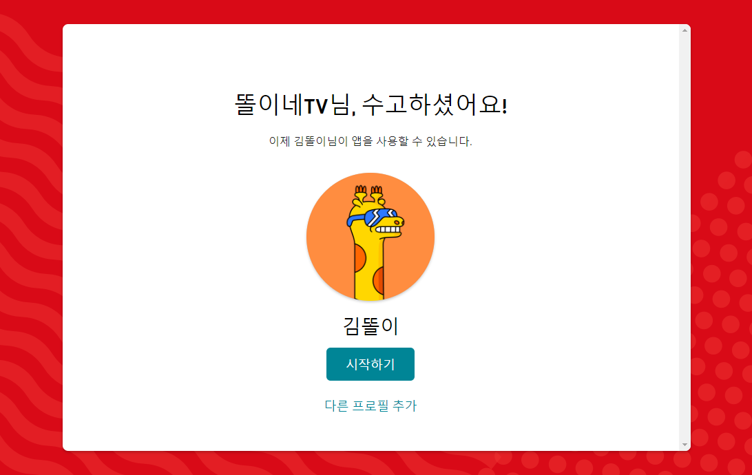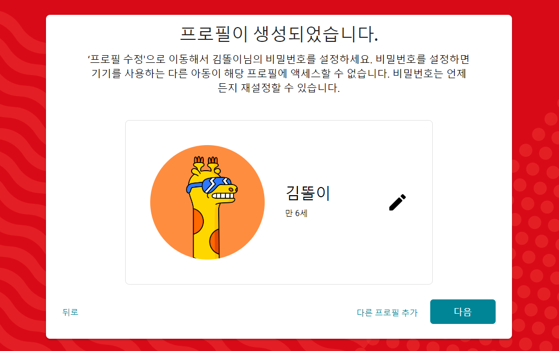 동의항목을 거치고 나면 아래와 같이 자녀의 이름과 연령을 입력하는 란이 나옵니다. 유튜브 키즈 역시 프로필을 여러 개 생성할 수 있고 각각 프로필별로 시청경험을 활용하기 때문에 자녀별로 프로필을 생성해 주시면 되겠습니다.