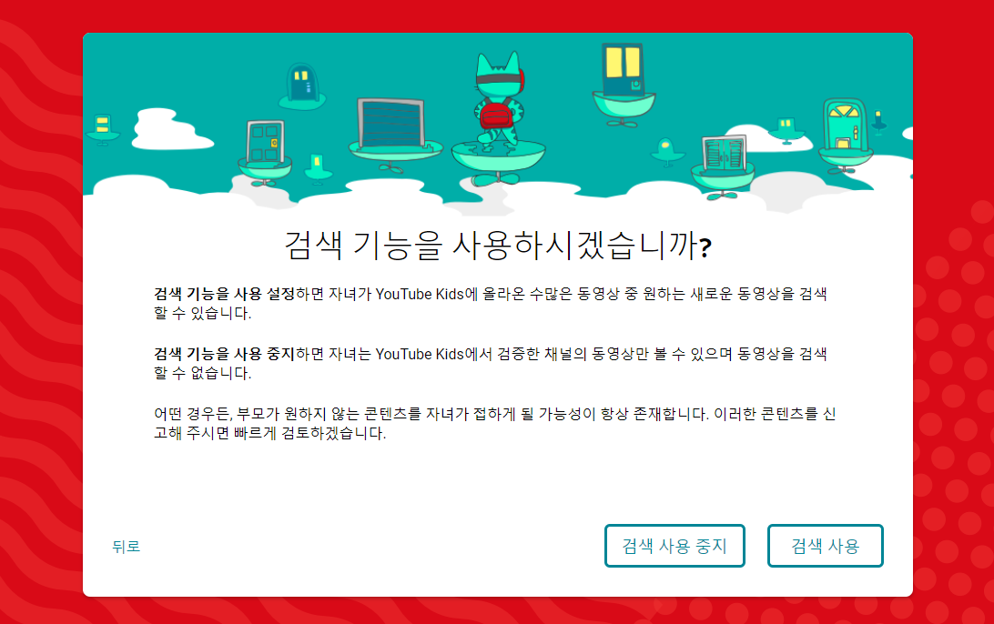 유튜브 키즈 콘텐츠 검색기능도 당연히 제공되는데요. 제한적이긴 하겠지만 그래도 아이들이 직접 본인이 좋아하는 콘텐츠를 검색해서 시청할 수 있도록 '검색사용'을 선택합니다.