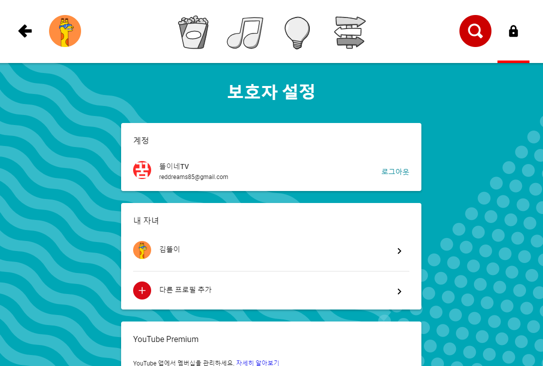 아무튼 보호자 설정메뉴에 가면 내 자녀를 추가할 수 있고, 자녀가 시청한 영상 기록도 확인할 수 있습니다. 아이들의 영상 콘텐츠를 어느 정도 제한하고 관리하는 목적에서 나온 별도의 서비스인 만큼 특정 채널을 추가하거나 차단하는 것도 가능합니다.