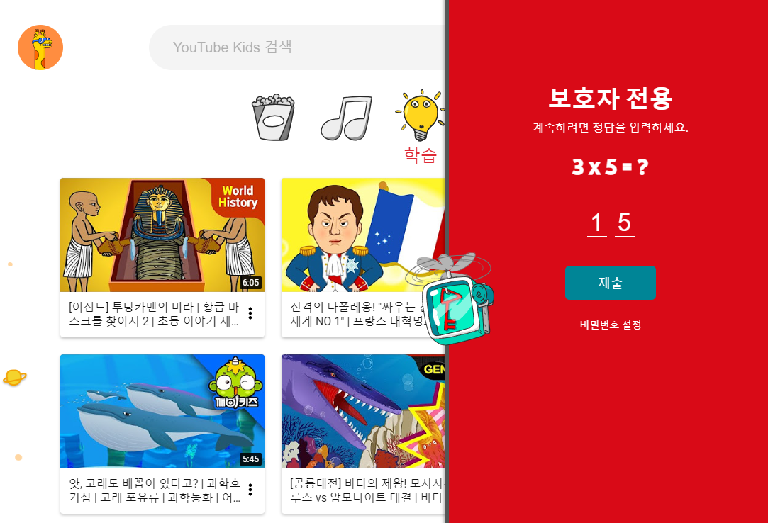 유튜브 키즈앱을 설정하고 싶을때는 우상단의 자물쇠 버튼을 눌러주면 됩니다. 간단한 문제가 나오고 답변만 하면 됩니다. 아차, 숫자를 알고 있는 아이들에게 이 문제는 안 먹히겠죠? 보호자 로그인 기능은 필요할 때 언제든지 비밀번호 4자리로 설정하는 게 가능합니다.
