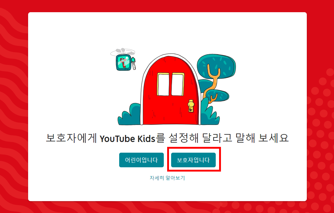 유튜브키즈 사이트에 접속하면 바로 설정이 가능한데요. 아래 페이지에서 '보호자입니다'를 선택합니다.