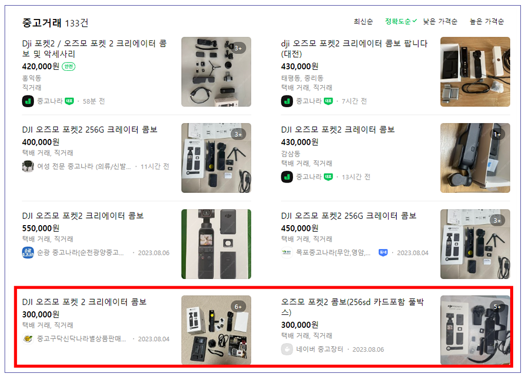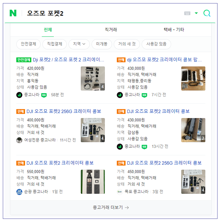 오늘도 평화롭게 유튜버의 꿈을 키워가는 필자는 스마트폰으로 영상을 좀 찍을라고 하면 자꾸 전화가 온다는 핑곗거리를 삼아 빠르고 간편하게 영상을 촬영할 수 있는 '오즈모 포켓2' 중고를 한번 검색해 봅니다. 신품이 63만 원인데 중고로 올라온 가격들이 생각보다 저렴하지는 않네요.