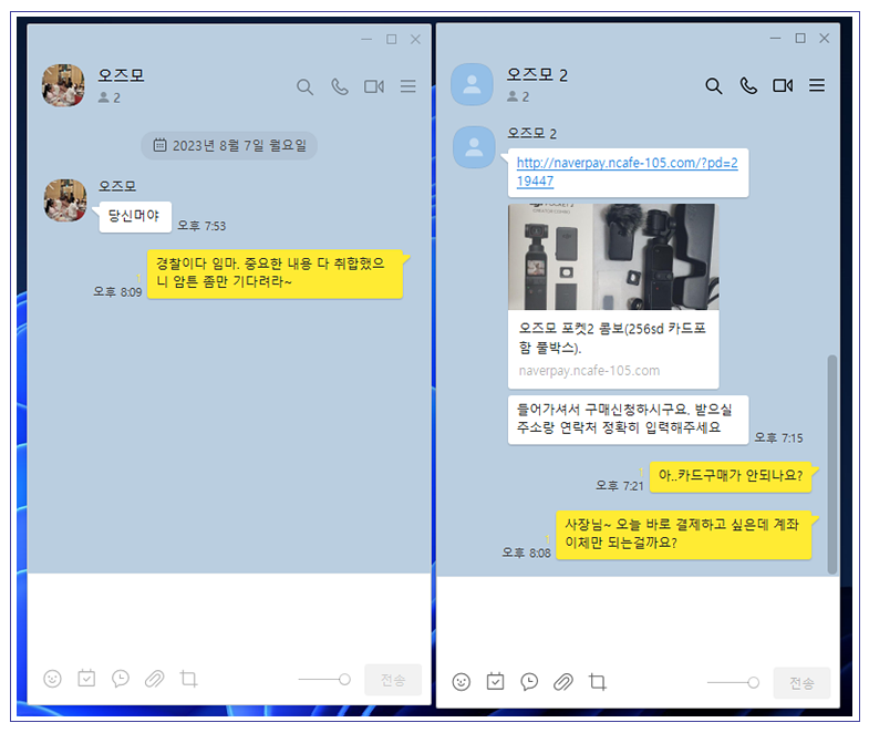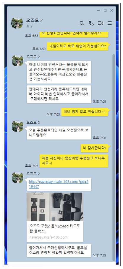 아무튼 동일제품을 너무나도 저렴한 가격에 올린 2건의 안전결제 사기꾼은 아래의 메시지를 끝으로 더 이상 연락이 없게 되었습니다.