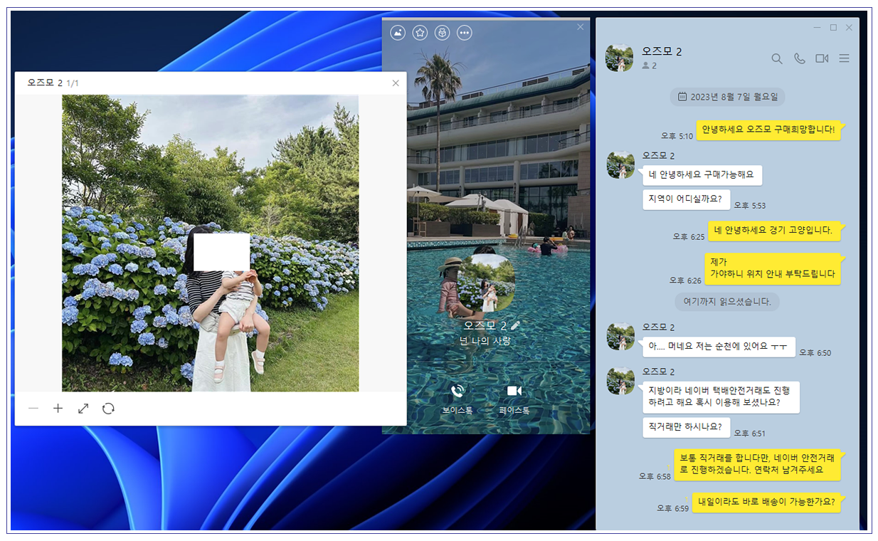 두 번째 게시물입니다. 마찬가지로 아이와 엄마사진이네요. (아차,, 사진은 분명 도용된 이미지일 것이라 가려두었습니다.) 이번에는 저에게 지역이 어디냐고 물어보네요. 뭐 안 봐도 제가 위치 말해주면 먼 곳을 말할 속셈이겠죠? 오잉... 그런데 바보같이 또 순천이라고 하네요. 제가 아까와 다른 사람이라고 착각하고 있나 봅니다. 본격적으로 멀리 있다고 하면서 택배안전거래를 유도하네요. 순순히 응해보도록 하겠습니다.