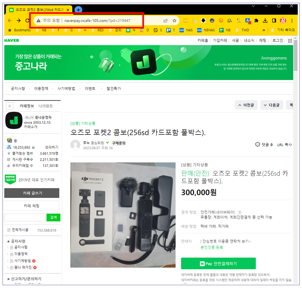 어쨌든 링크를 클릭해 봤는데... 우와... 여기 들어온 이상 진짜 중고나라 카페랑 똑같아서 주소창을 보지 않고서야 무조건 당할 수밖에 없을 것 같네요. 실제 네이버 카페를 모방하기도 했지만 일부는 몰라볼 정도로 연동을 해놔서 인터넷 활용이 많지 않거나 중고나라 이용경험이 많지 않으신 분들은 이 사이트가 피싱 사이트인지 알아채기 정말 어려울 듯합니다.