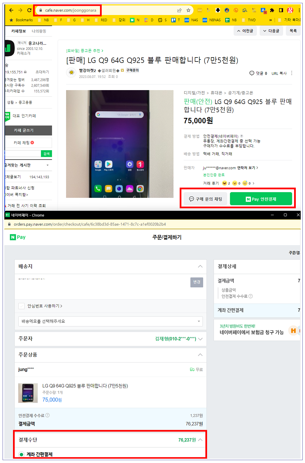 무엇보다 중요한 것은, 이렇게 링크가 오지도 않지만 링크가 온다고 하더라도 사이트주소만 보면 바로 가짜인지 진짜인지 구분이 가능합니다. 혹시라도 안 보고 그냥 주소를 눌렀다고 하더라도 상단 주소표시줄에 '주의요함'이 뜨면서 자물쇠가 없으면 무조건 피싱 사이트라는 점 꼭 기억해 주세요. (네이버는 모든 인터넷 주소를 HTTPS라 불리는 보안프로토콜을 사용하고 있으며, 크롬 및 웨일 등 웹브라우저 또한 HTTPS가 아닌 페이지에 주의나 경고 표시를 꼭 띄워줍니다. 또한, 전자상거래 규정상 개인정보, 결제정보가 포함되는 모든 페이지는 반드시 HTTPS를 사용해야 하는 관련 법령이 있으니 네이버 카페가 아닌 다른 쇼핑몰, 홈페이지에서도 HTTP 일반 프로토콜 주소를 사용하는 곳이 있다면 꼭 의심 먼저 해보시기 바랍니다.)
