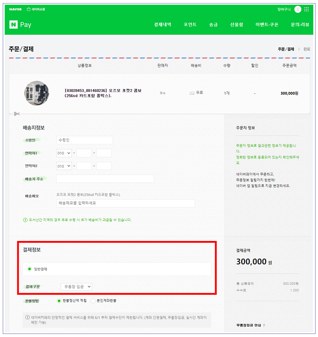 드디어 결제페이지입니다. 여기서 이름, 연락처, 주소지를 입력하면 또 한 번 개인정보가 털리게 됩니다. 무통장입금까지 신청하고 실제 송금까지 했으면 ㅠㅠ 아차, 진짜 네이버 안전결제 페이지에는 간편결제 기능이 존재하기 때문에 마찬가지로 눈썰미가 조금이라도 있으신 분들은 이곳이 가짜임을 깨닫겠지만 그렇지 않으신 분들은 마찬가지로 송금하고 물건이 언제 오나 기다리시겠죠ㅠㅠ?