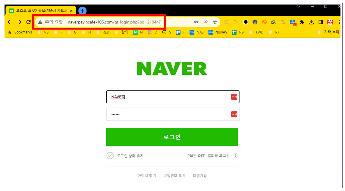 실제 네이버 카페는 레이아웃과는 조금 다르기는 하니 어쨌든 '네이버페이 안전결제하기'결제를 눌러보았습니다. 네이버 로그인창이 나오는데 이 역시 가짜 사이트입니다. 가짜 사이트라 아무렇게 입력해도 다음페이지로 넘어가지지만 여기서 네이버 계정을 입력하시면 네이버 계정이 털리게 됩니다.