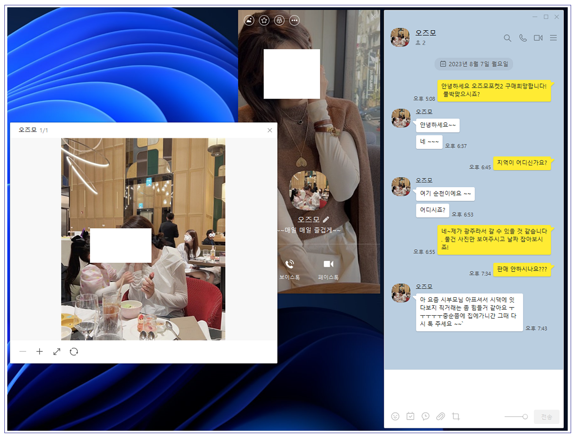 자.. 바로 체크 들어가 보겠습니다. 우선 첫 번째 연락처로 카톡을 등록해 보았습니다. 아이와 엄마 사진으로 안심을 시키고 있네요. 일단 사기꾼인지 체크하기 위해서 먼저 지역을 물어보았습니다. 순천이라고 하네요. 그래서 갈 생각도 없었지만 저는 그나마 근처인 '광주'라고 하고 바로 직거래하러 달려간다고 했습니다. 역시나... 시부모님 핑계를 대면서 거래를 못한다고 하네요. 이렇게 첫 번째 사기꾼과의 거래는 끝났습니다.