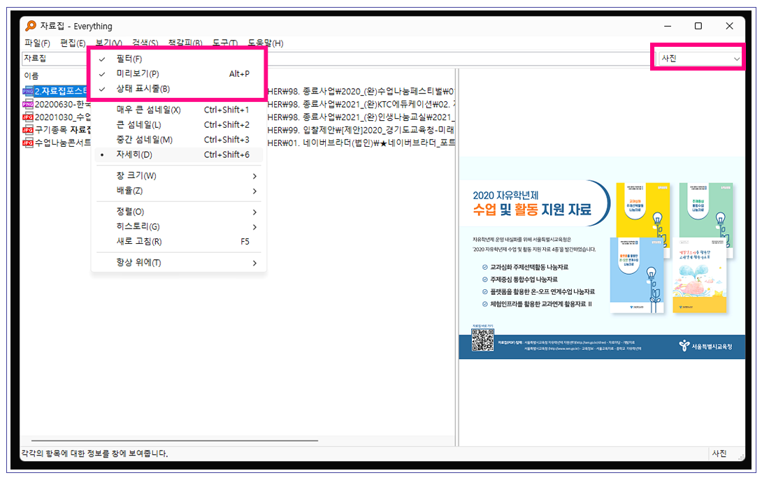 프로그램을 실행하면 아래와 같은 화면이 나오는데요. 여기서 필수적으로 해야 할 기본 세팅으로 상단 보기 탭에서 '필터, 미리보기, 상태표시줄'을 모두 체크해 두시면 보다 빠른 검색이 가능합니다.