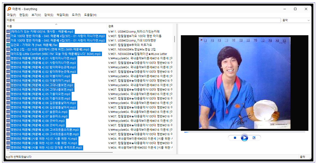 everything의 중요한 점은 더 있습니다. 아래와 같이 '이문세'키워드의 '음악'을 검색한 후 선택을 했는데 우측 미리보기 창으로 해당 음악의 썸네일과 재생바가 제공됩니다. 여기서 플레이 버튼을 누르면 음악이 곧장 재생됩니다. 즉, 파일을 단순히 찾아주는 것이 아니라 실행 기능까지 제공해 준다는 것입니다.