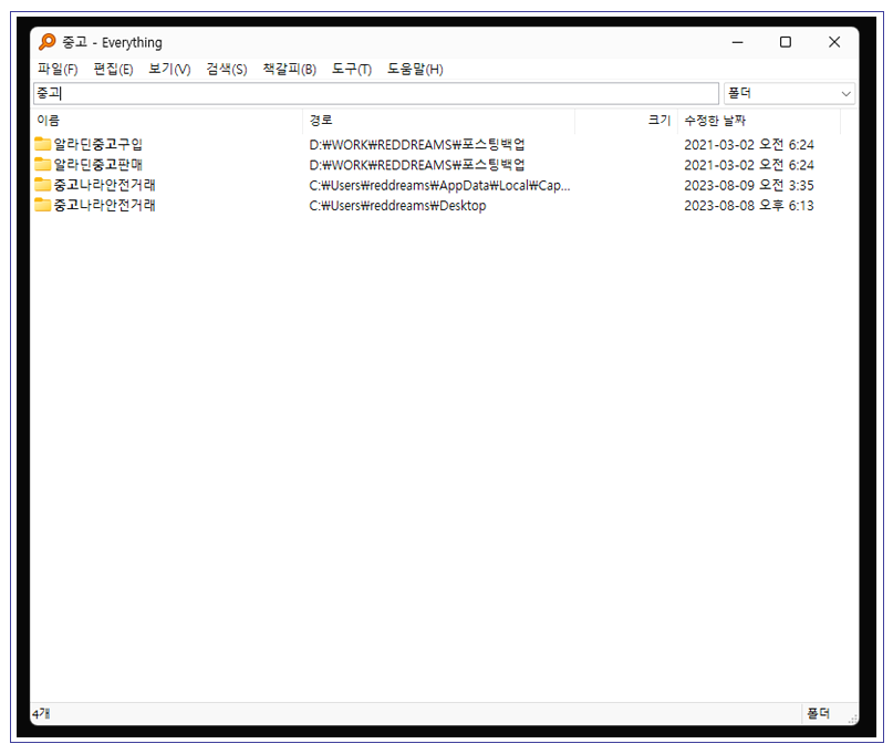 이번에는 필터검색을 해보겠습니다. 우측 상단 필터란에서 '폴더'를 선택하고 '중고'라는 키워드를 입력하니 곧장 해당 키워드가 포함된 총 4개의 폴더를 보여줍니다.