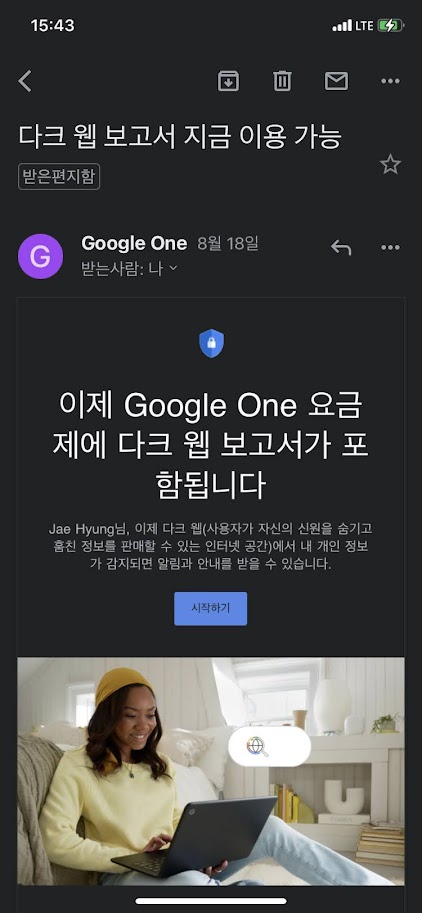 구글에서 이러한 '다크웹'에 내 개인정보가 포함되어있는지 알려주는 서비스를 시작했는데 그것이 바로 '다크 웹 보고서'입니다. 오늘은 구글 원 사용자들에게 제공되기 시작한 다크웹 보고서를 직접 실행해 보고 그 결과에 대해서 간략히 알아보고자 합니다. 먼저 아래와 같이 구글원 사용자들에게는 아래와 같은 이메일이 왔을 텐데요. 바로 시작을 눌러보겠습니다.