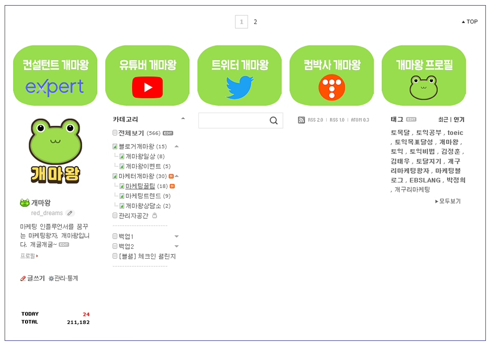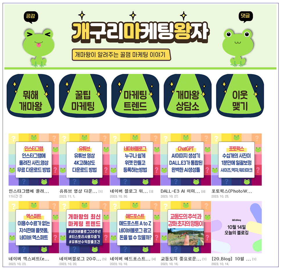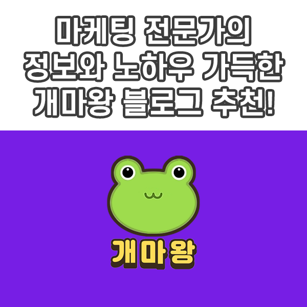 자 오늘 추천드릴 마케팅 블로그는 바로 '개구리마케팅왕자, 개마왕'입니다. 기분이 좋아지는 블로그이니 아래 링크를 통해 한번 놀러가보시기 바랍니다. 자 그럼 이 블로그가 어떤 콘텐츠를 담고 있는지 바로 한번 확인해 보겠습니다.
