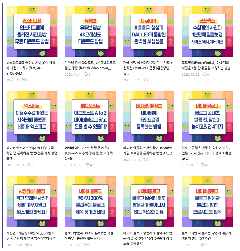블로그는 이렇게 생겼는데... 벌써부터 전문가 느낌이 물씬 풍기네요. 디자인도 아주 귀엽고, 캐릭터와 이름이 아주 딱 맞아 떨어지네요. 썸네일도 너무 이쁘고 콘텐츠가 아주 직관적으로 확인이 됩니다.