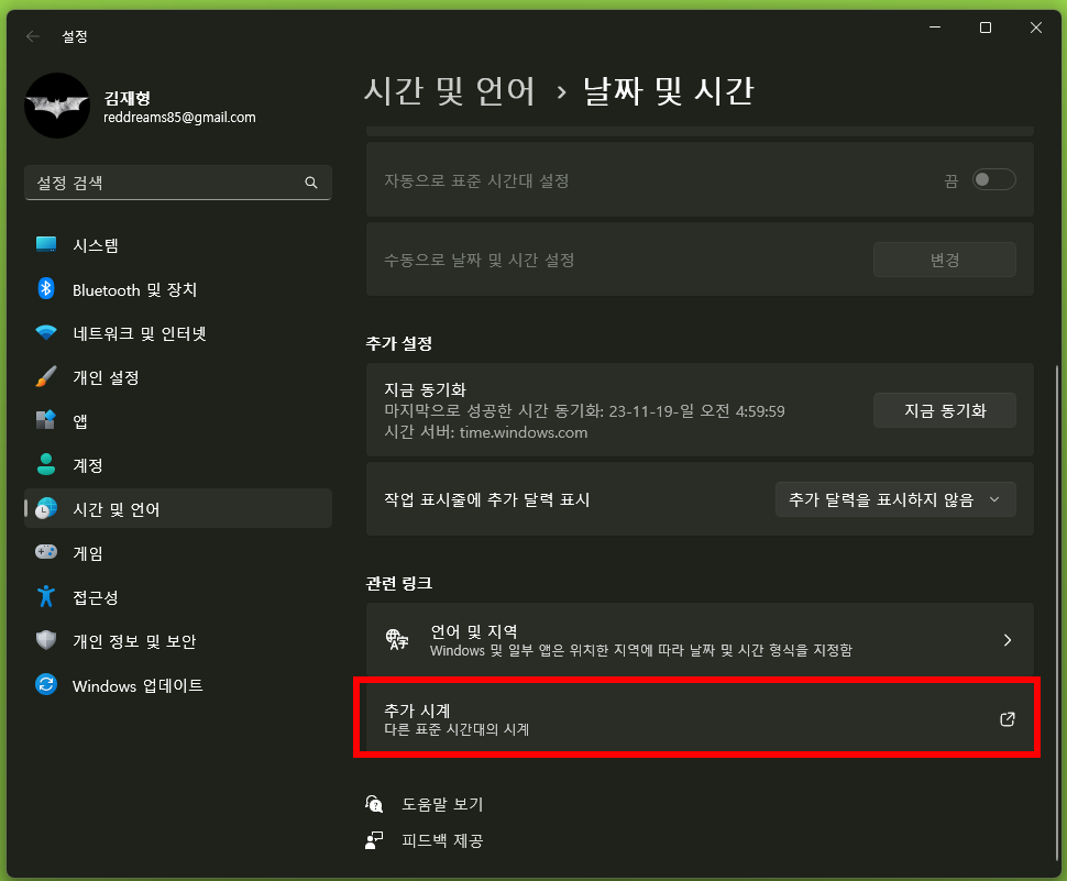 설정 > 시간 및 언어 메뉴에서 '날짜 및 시간'이 나오고 여기서 '추가 시계' 버튼을 클릭해 줍니다.
