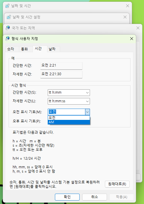 추가로 이 화면에서는 달력뿐만 아니라 시계 규칙도 변경할 수 있습니다. 오전/오후로 되어 있는 것을 간단히 AM/PM으로 변경하는 것도 가능하고, 12시간 기준으로 돌아가는 규칙을 24시간 규칙으로 변경하는 것도 가능합니다.