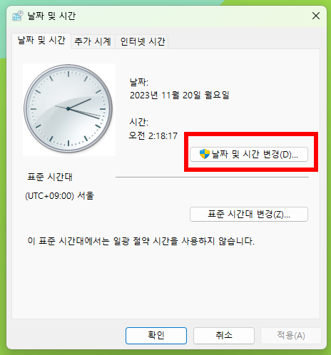 이제 '날짜 및 시간' 설정 창이 뜨는데요. 여기서 '날짜 및 시간 변경' 버튼을 눌러줍니다.