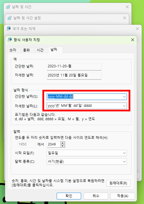 형식 사용자 지정 > 날짜 메뉴를 통해서 드디어 원하는 기능을 내 마음대로 세팅할 수 있습니다. 하단의 날짜 형식에 보시면 '간단한 날짜'와 '자세한 날짜'가 있는데 간단한 날짜는 그냥 작업표시줄에 표현되는 날짜이고, 자세한 날짜는 마우스를 올렸을 때 표현되는 규칙입니다.